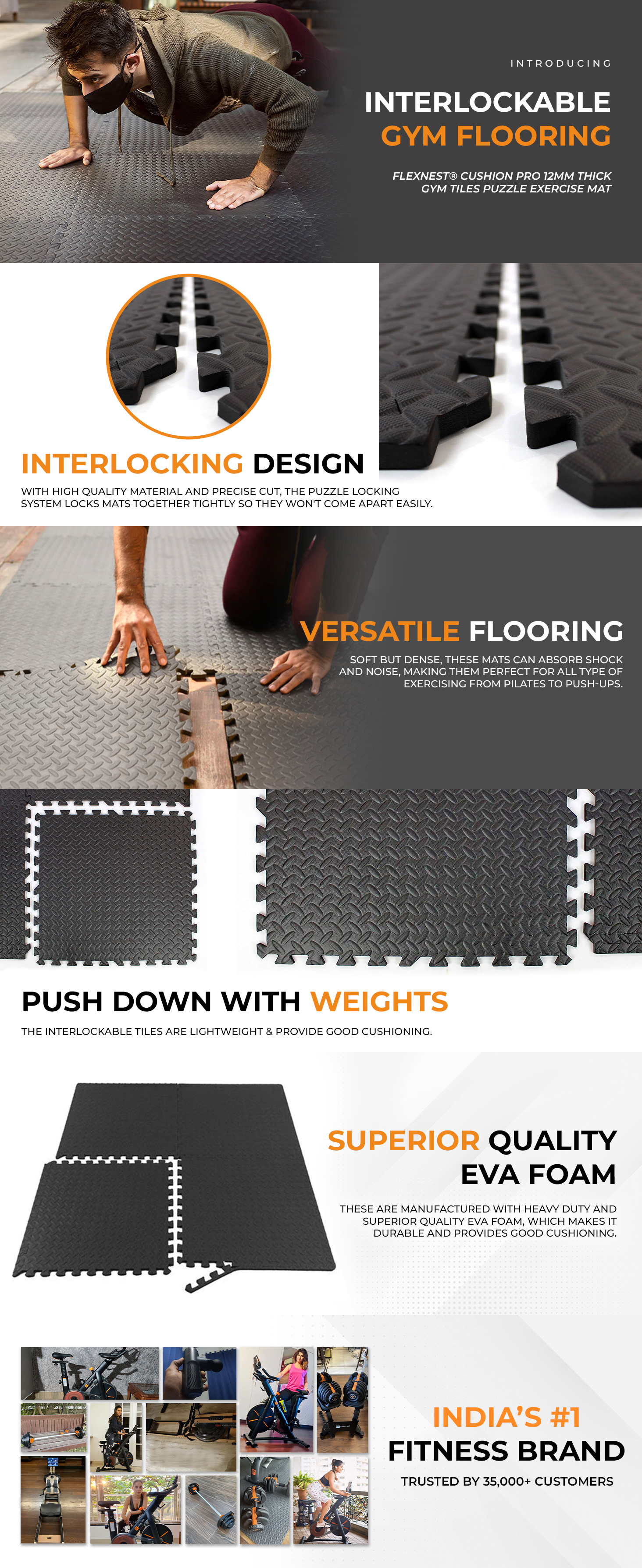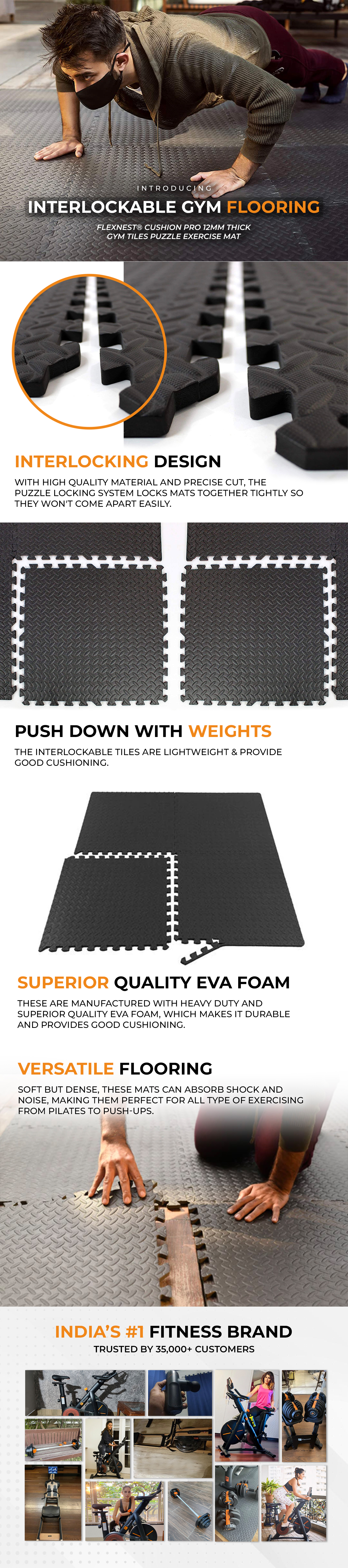 Our CushionPro Interlockable Gym Flooring is tailor made to give you extra comfort and convenience while working out at home. These are manufactured with heavy duty and superior quality EVA foam, which makes it durable and provides good cushioning.