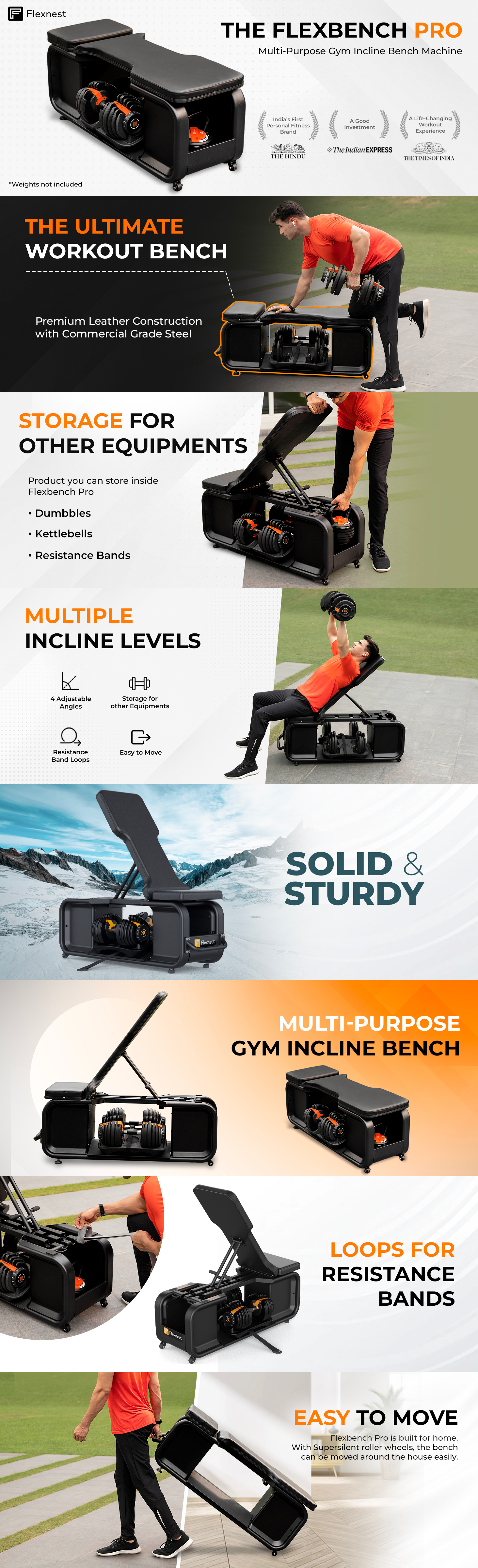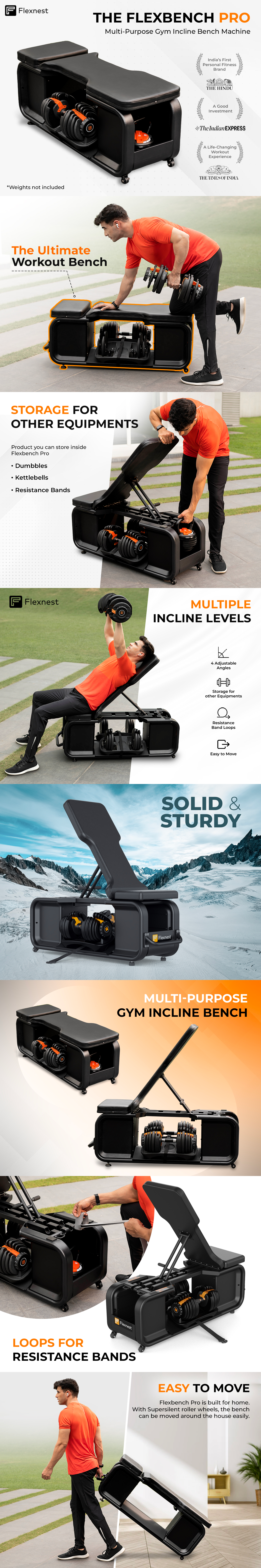 The Ultimate bench with dedicated storage holds all the tools for your workout! Its our Patented Design that has in-built adjustable dumbbell, kettlebell and other storage to store accessories like resistance bands, yoga mats, bottles and more! Note: Dumbbells & other accessories sold separately