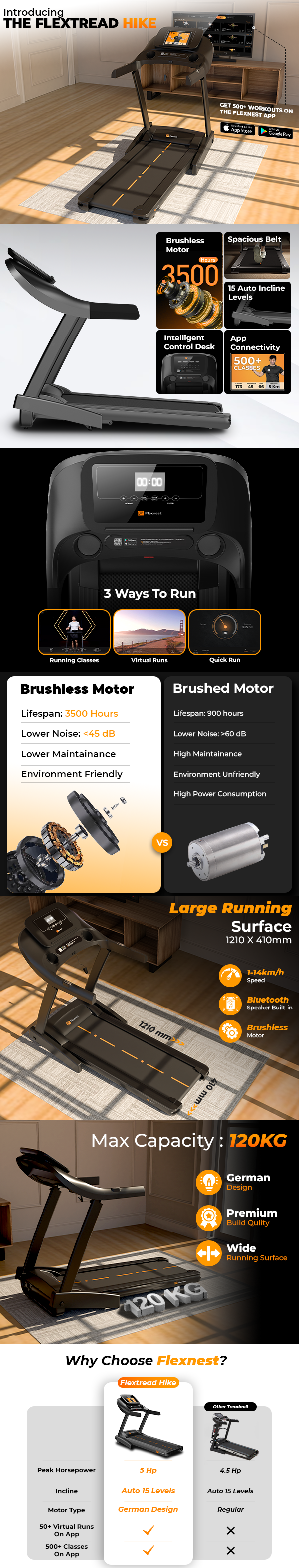 The Flextread Hike is India's 1st Smart Treadmill with 15-Level Auto Incline for home. Includes 500+ Trainer-Guided Workouts and 50+ Virtual Walks. Walking + Running modes, Bluetooth Speaker, LED Display & Speeds up to 14 km/hr. 1 Month Free Membership.