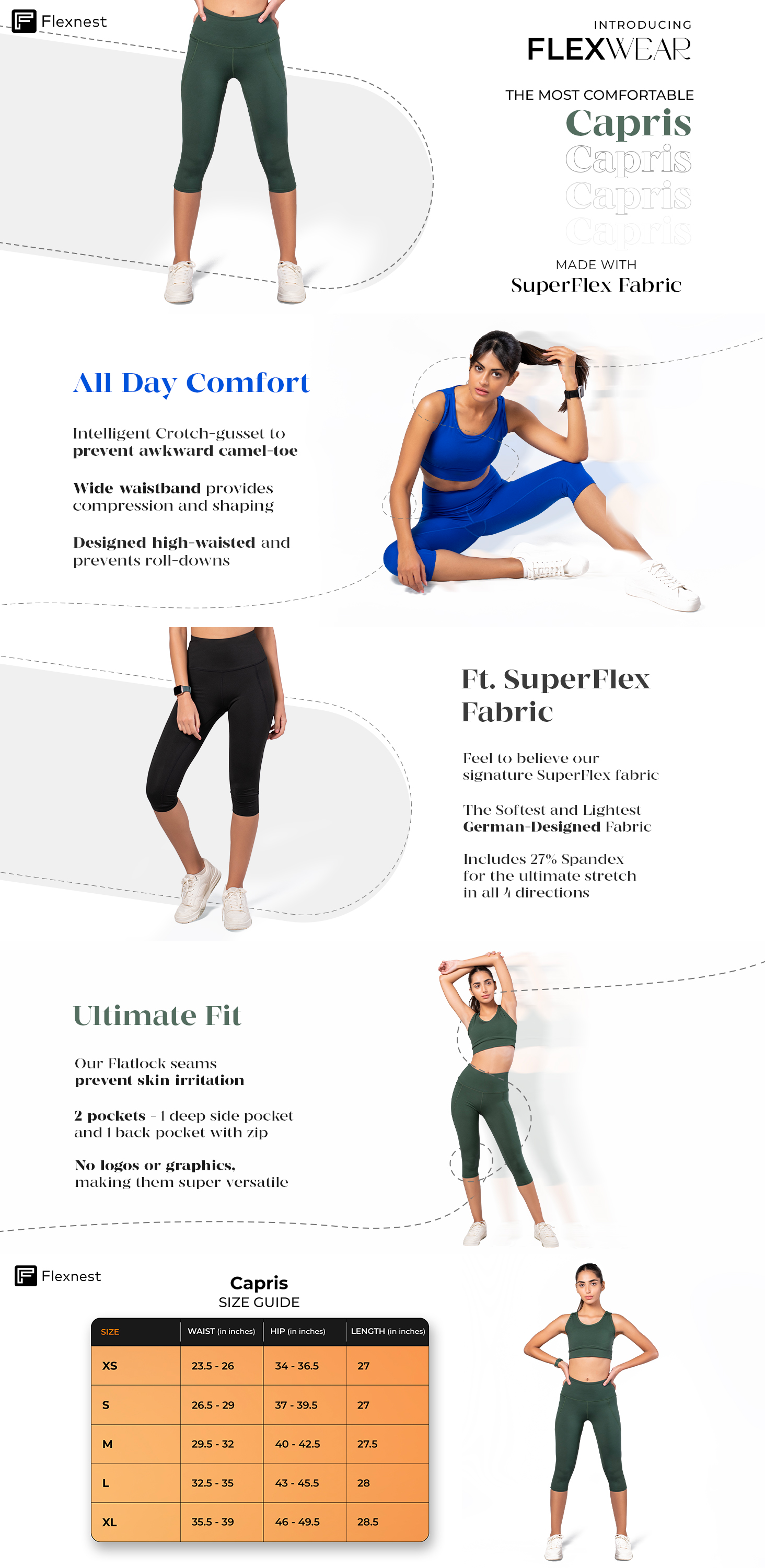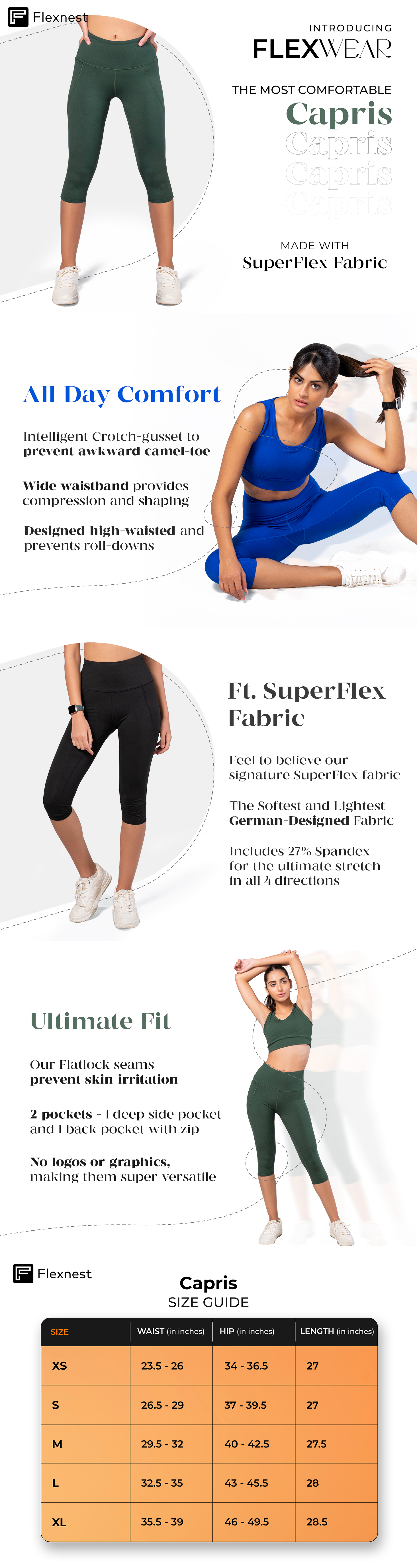 The Flex Capris are the most comfortable capris you will ever wear. Period. With our signature SuperFlex Technology, they are designed for All-Day, Everyday wear. They come with an extra flex that adds the much needed comfort for all day activities from your workouts, to travel or even work! We also made sure to keep things minimal and discreet and the Flex Capris have no logos or graphics, making them extremely versatile to pair with any look!