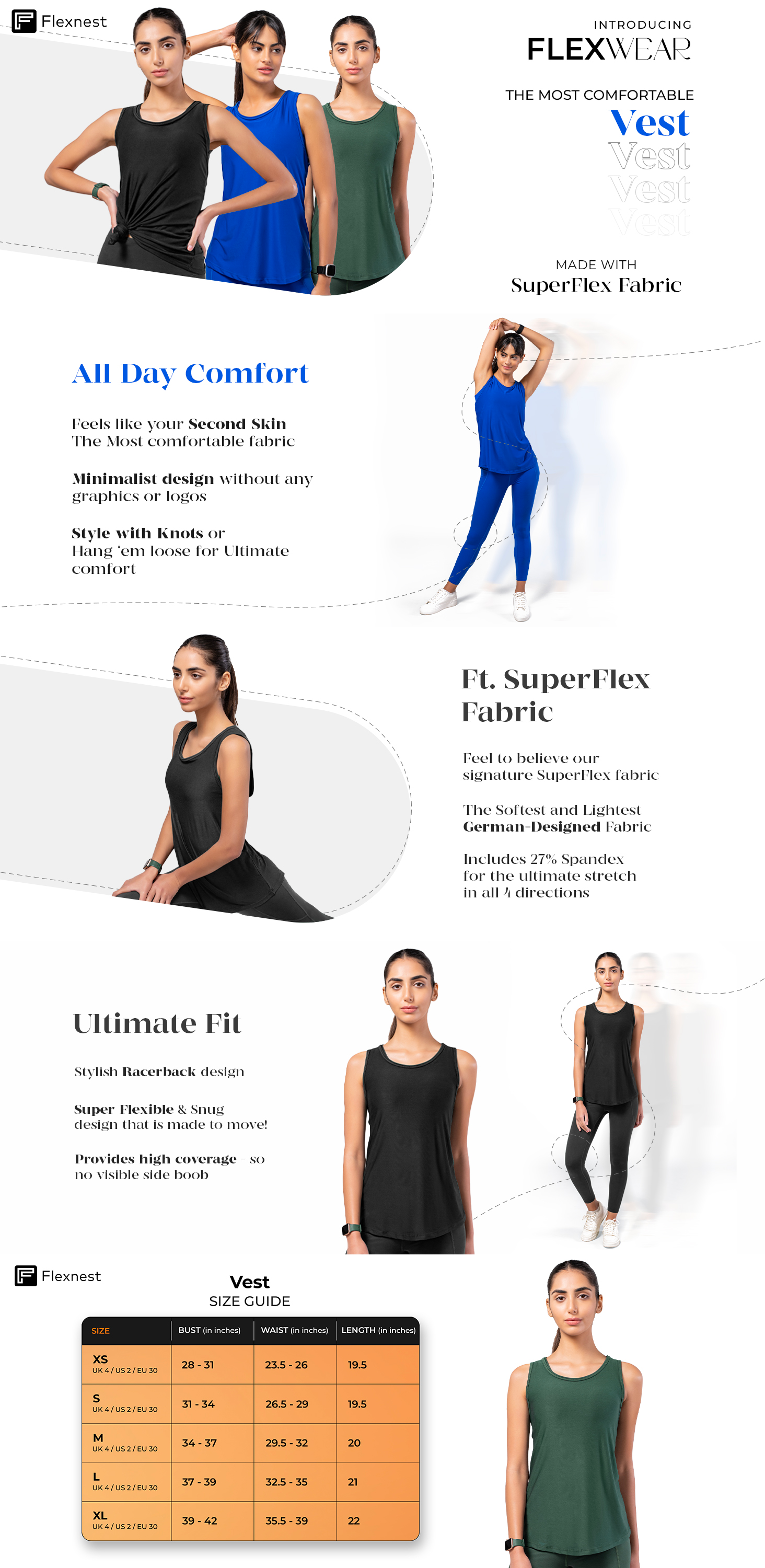 The Flex Vests are an essential you're going to need. With our signature FlexSoft technology, they are designed for All-Day, Everyday wear. They can be worn over the Flex Sports Bra or as is. We also made sure to keep things minimal and discreet and the Flex Vests have no logos or graphics, making them extremely versatile to pair with any look!