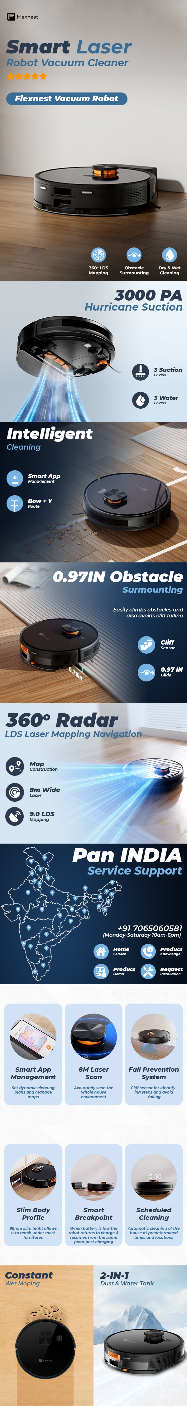 Introducing the Flexnest 3-in-1 Robot Vacuum Cleaner: Powerful suction, long battery life, and advanced laser mapping for precise, thorough cleaning. Multiple modes and app control offer customized, hands-free operation, keeping your floors spotless with ease.