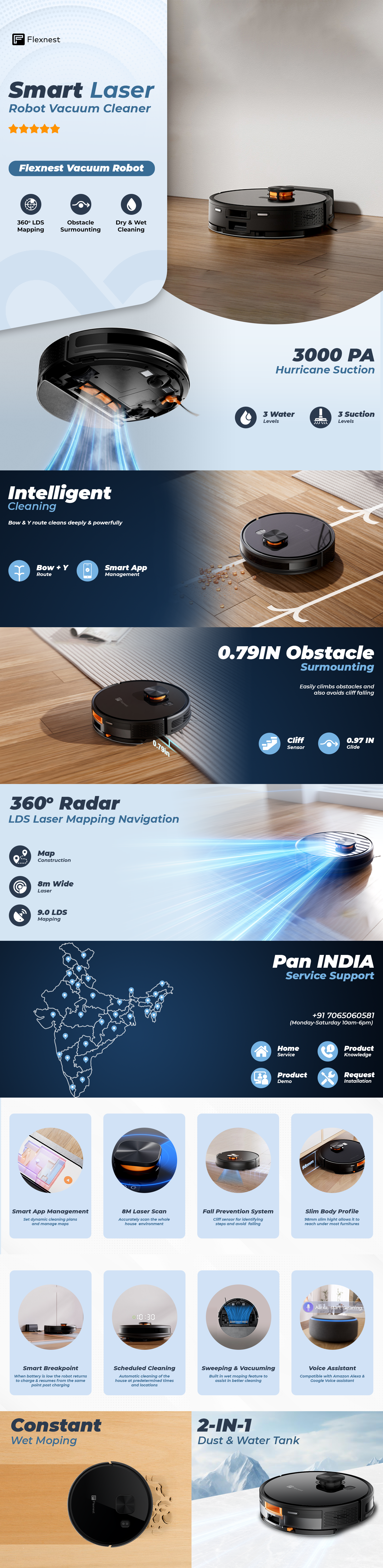 Introducing the Flexnest 3-in-1 Robot Vacuum Cleaner: Powerful suction, long battery life, and advanced laser mapping for precise, thorough cleaning. Multiple modes and app control offer customized, hands-free operation, keeping your floors spotless with ease.