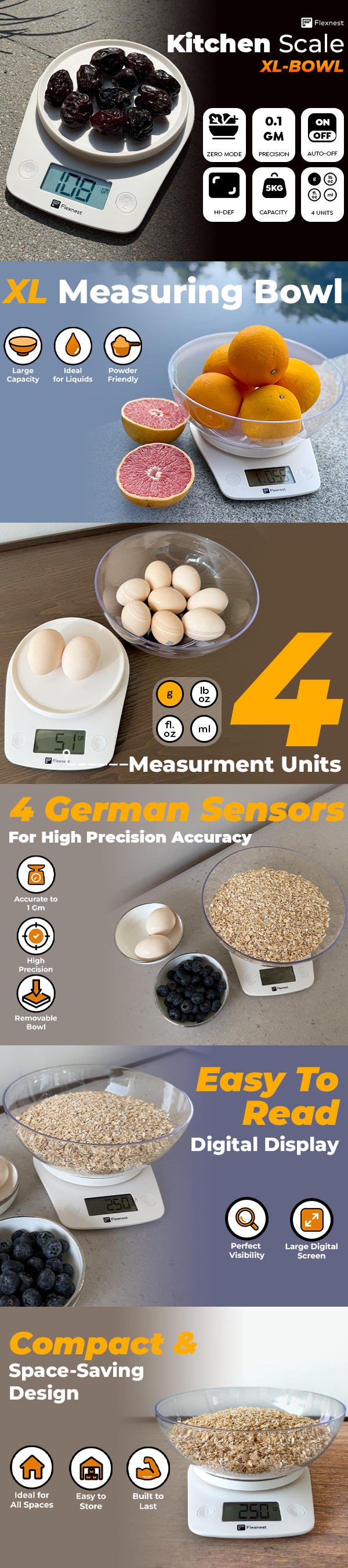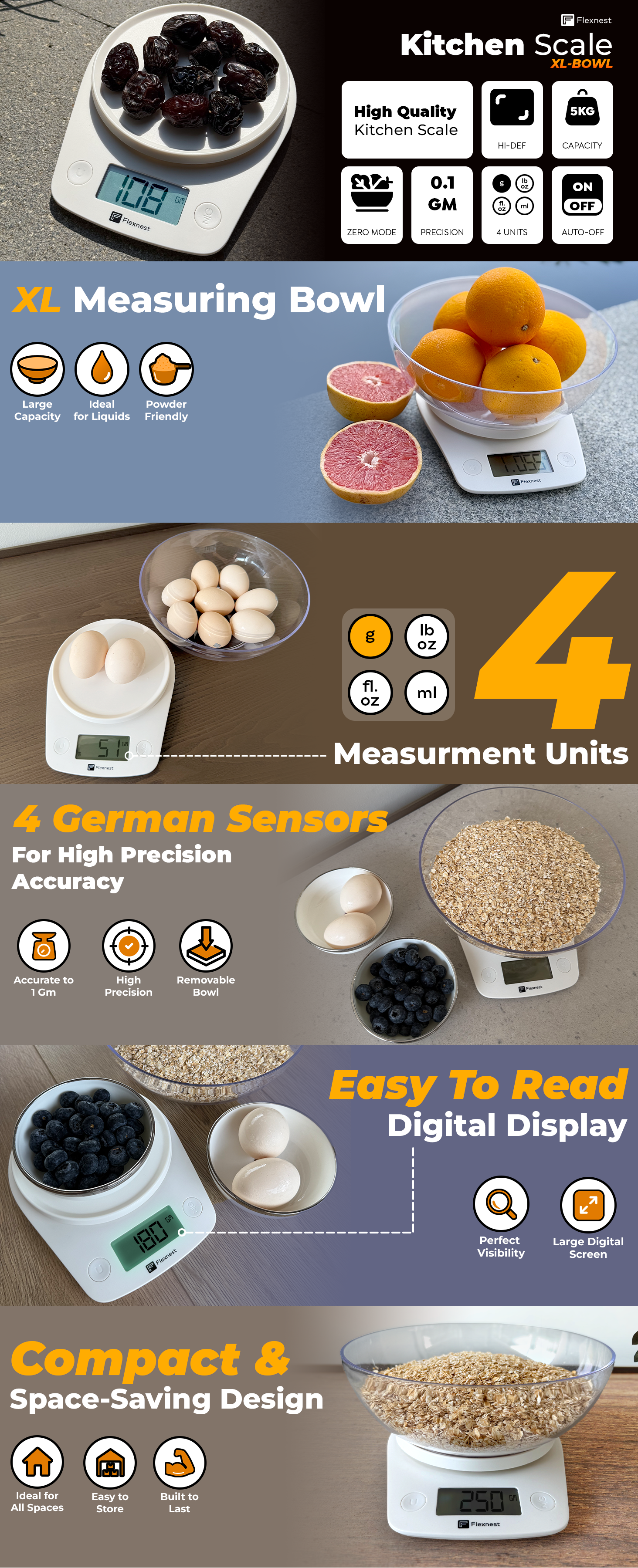 Introducing Flexnest Kitchen Scale: Accurately measure water, milk, and more with dual weight and volume units. Features precision sensor, tare function, low battery, and auto-off for easy use
