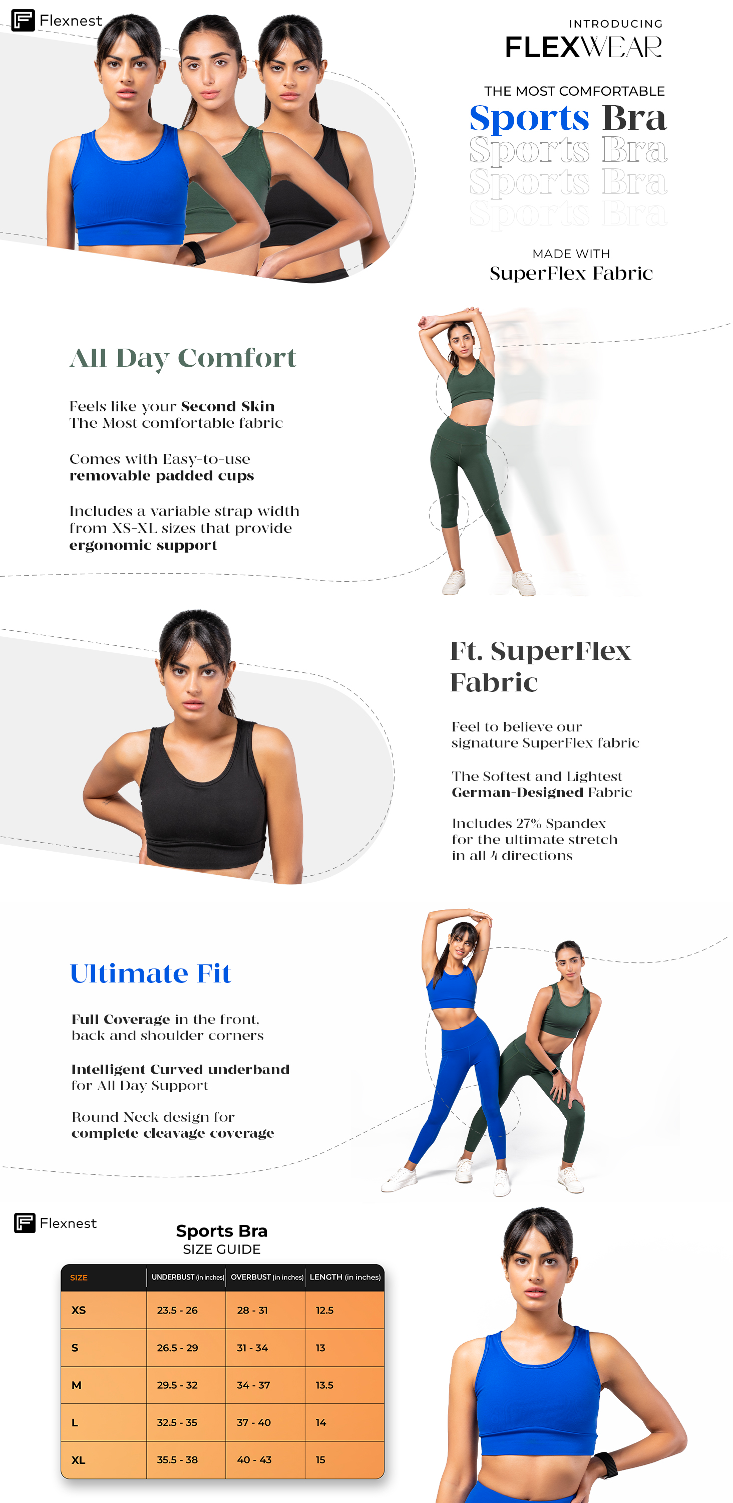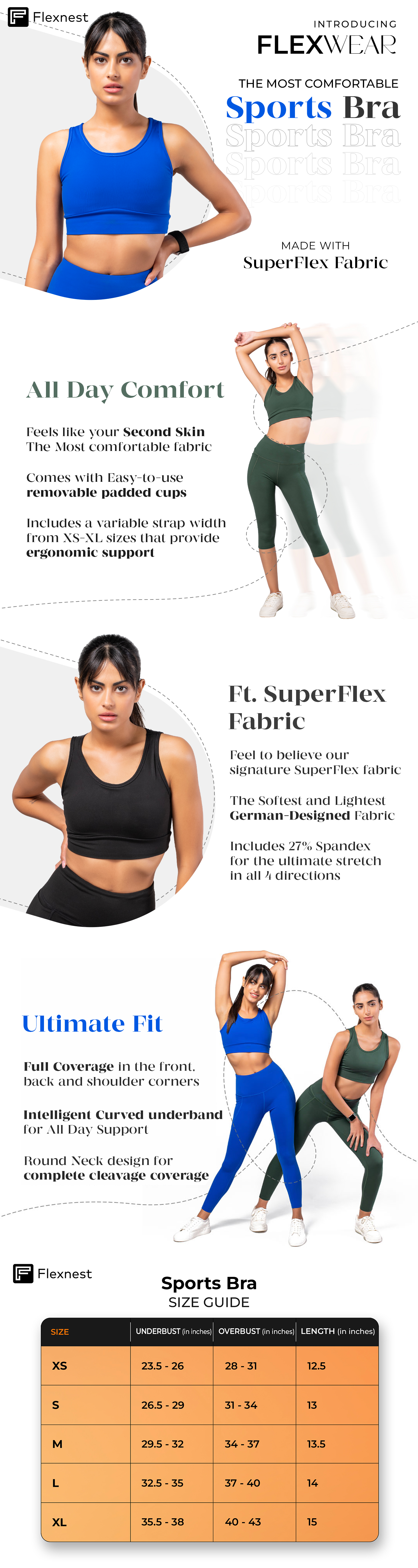 The Flex Sports Bra is the most comfortable sports bra you will ever wear. Period. With our signature SuperFlex technology, it is designed for All-Day, Everyday wear. It comes with an extra flex that adds the much-needed comfort for all day activities from your workouts, to travel! We also made sure to keep things minimal and discreet and the Flex sports bra has no logos or graphics, making it extremely versatile to pair with any look!