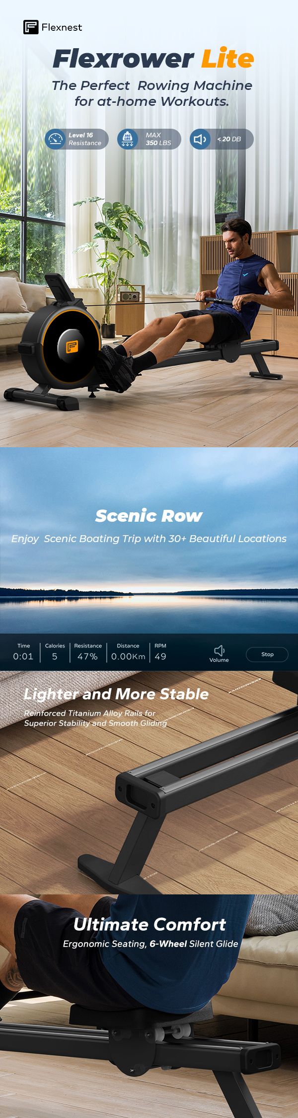 Introducing the Flexrower Lite from Flexnest - the perfect entry-level rowing machine for at-home workouts. This smart, Bluetooth enabled magnetic rower is designed to help you achieve your fitness goals from the comfort of your own home.