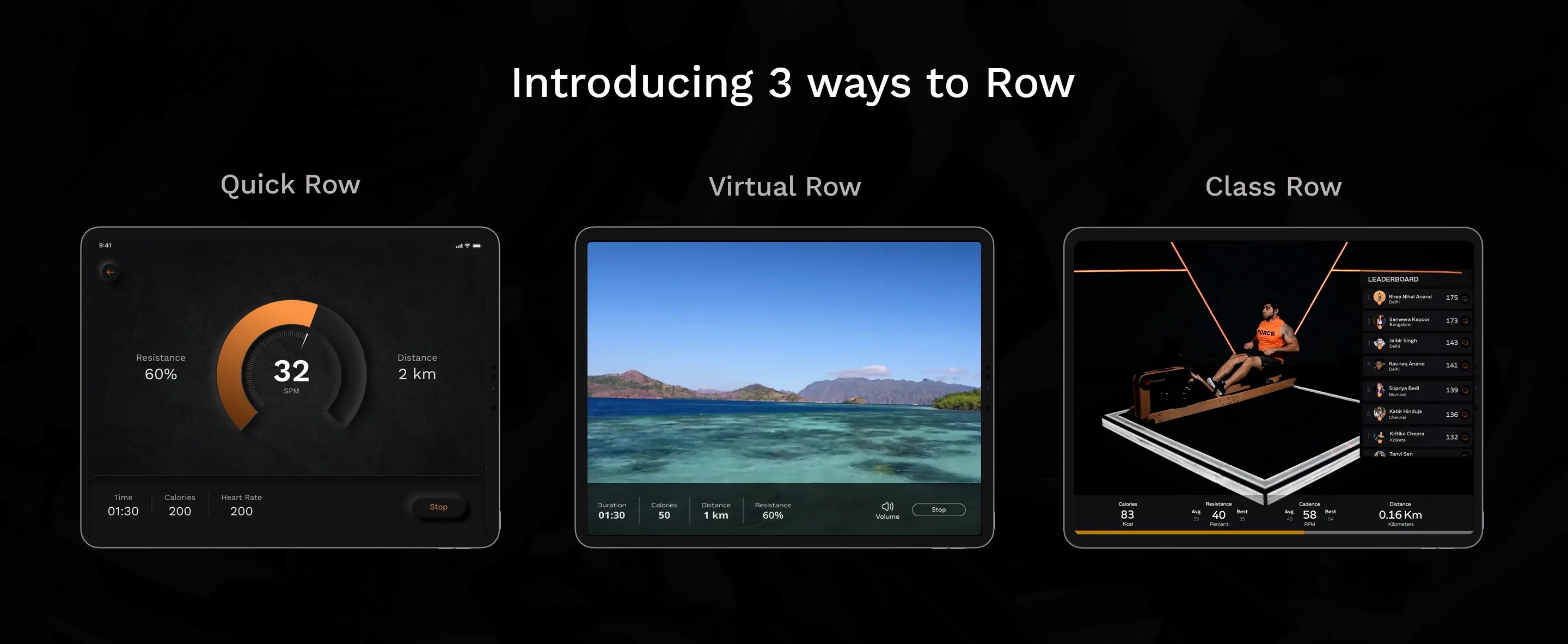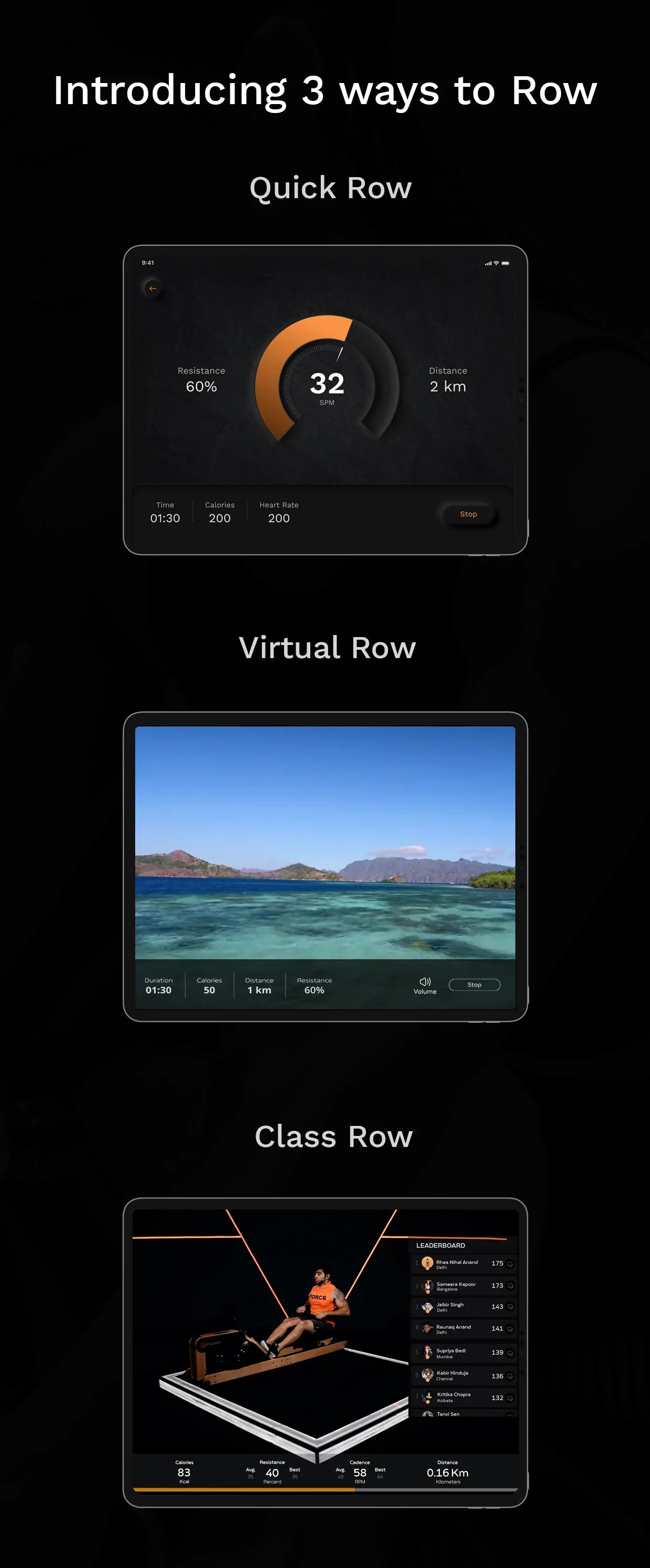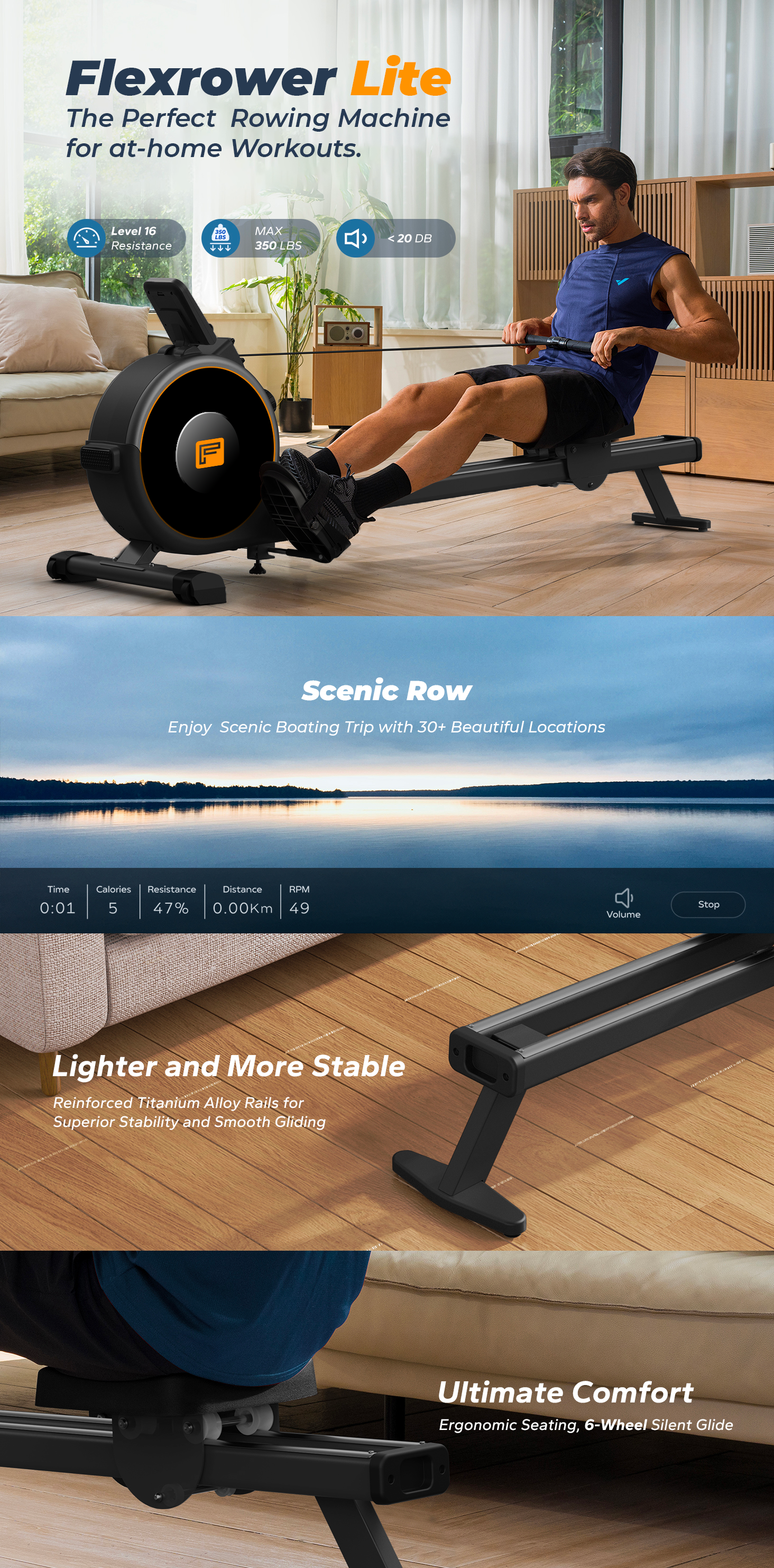 The Flexrower Lite offers scenic routes in over 30+ exotic locations across the world from Italy to Thailand. Go row in a different ocean or lake everytime - right from your bedroom.
