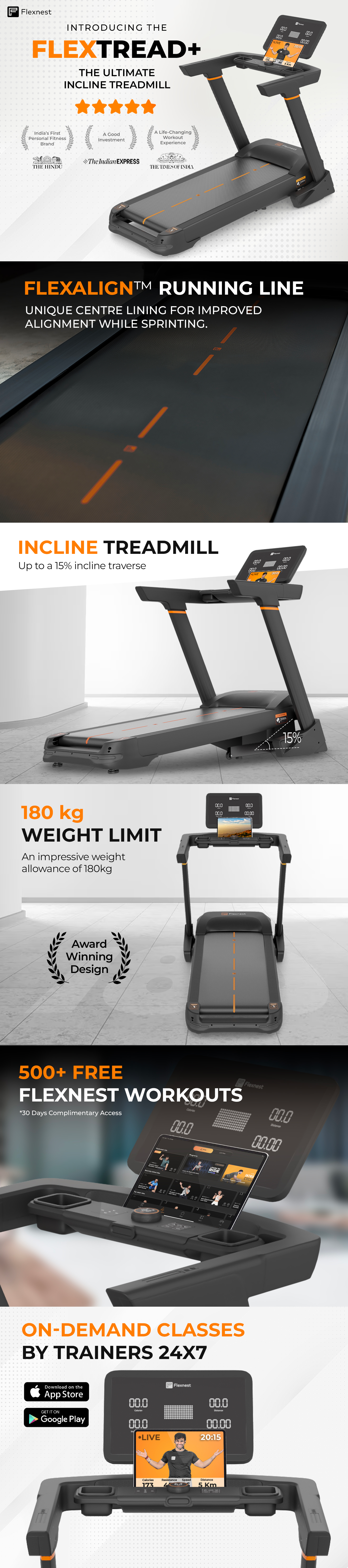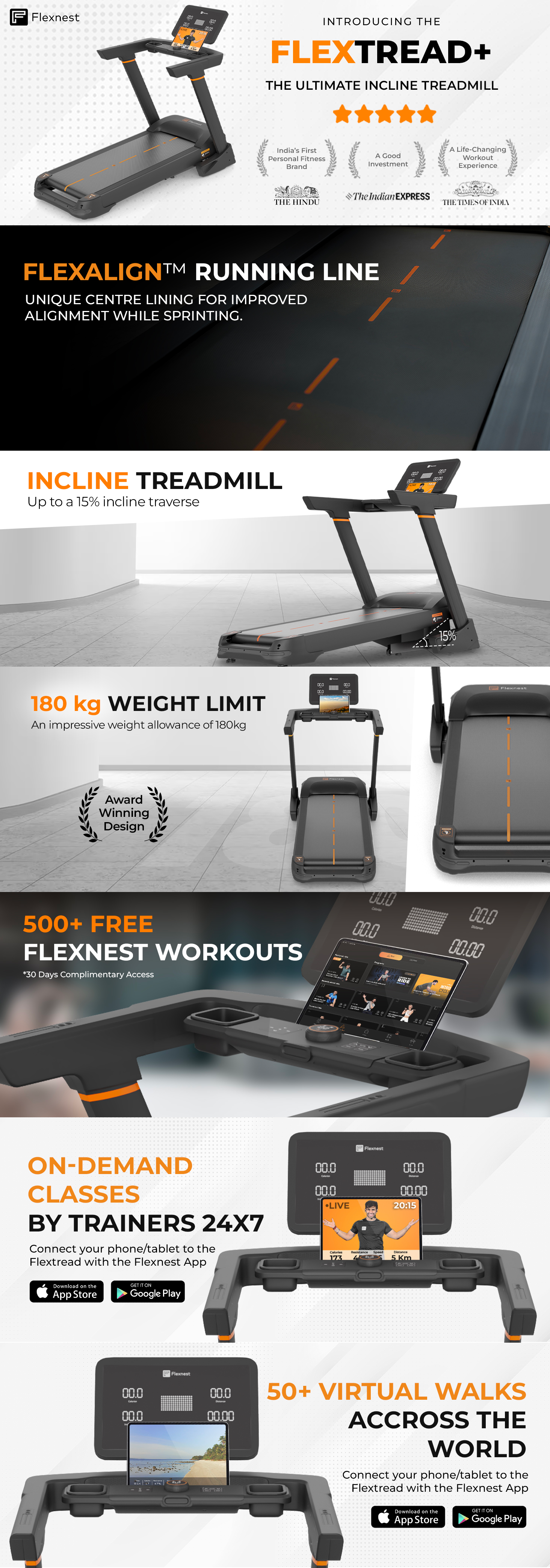 The Flextread+ is the ultimate commercial grade treadmill with incline upto 15% & speeds up to 18.8km/hr . Includes 1000+ Trainer Guided workouts and 50+ Virtual Walks. Walking + Running modes, Bluetooth Speaker. 1 Month Free Membership.